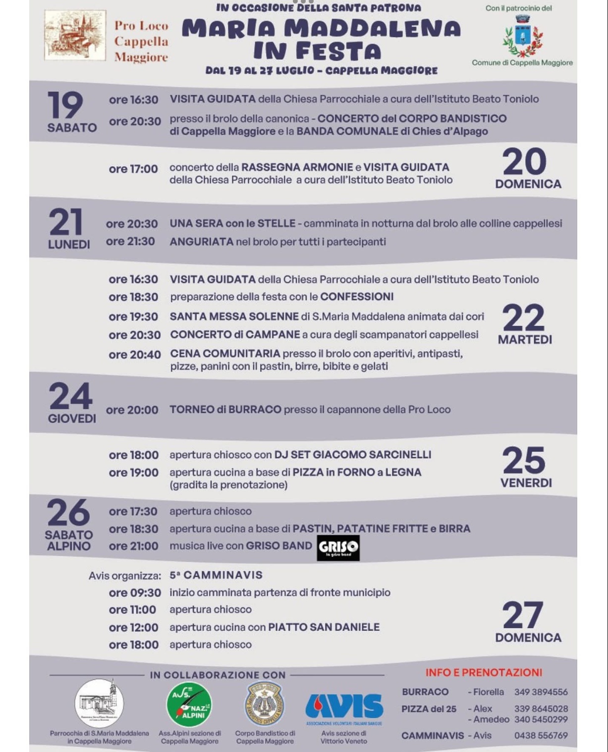 La Pro Loco di Cappella Maggiore con il patrocinio del Comune di Cappella Maggiore e la collaborazione della Parrocchia di Santa Maria Maddalena, l’AVIS, il Corpo Bandistico di Cappella Maggiore e la Sezione Alpini di Cappella Maggiore ha organizzato in occasione del patrono Maria Maddalena in Festa 2025.