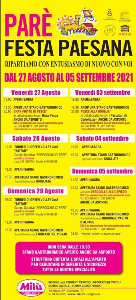 La Parrocchia della Beata Vergine Maria di Fatima, il Gruppo Festeggiamenti Parè ed El Bareto e con il patrocinio del Comune di Conegliano hanno organizzato Parè Festa Paesana 2021 nei giorni 27-28-29 agosto e 3-4-5 settembre 2021.