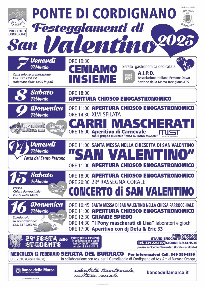 La Pro Ponte con la collaborazione della Pro Loco Cordignano e con il patrocinio del Comune di Cordignano ha organizzato i Festeggiamenti San Valentino 2025.