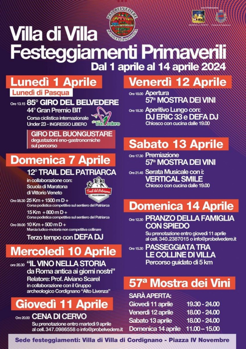 L’Associazione Sportiva Dilettantistica Pro Belvedere con il patrocinio del Comune di Cordignano e della Regione Veneto ha organizzato i Festeggiamenti Primaverili a Villa di Villa 2024.