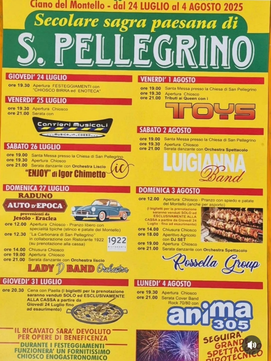 La Secolare Sagra Paesana di San Pellegrino 2025 si terrà dal 24 luglio al 4 agosto 2025 a Ciano del Montello.