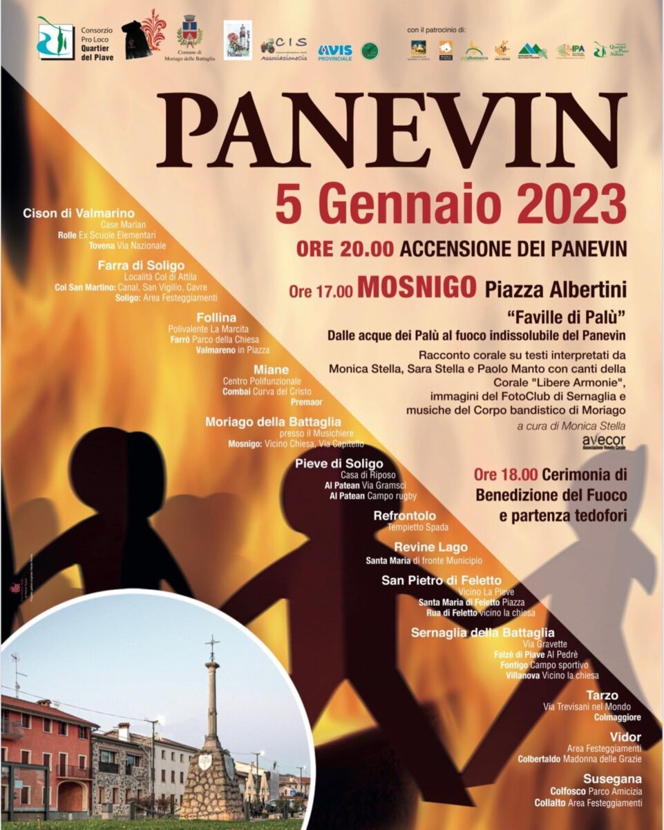 Il Consorzio Pro Loco del Piave, con la collaborazione delle associazioni sul territorio e con il patrocinio della Regione Veneto, della Provincia di Treviso, Unpli Treviso, Comunità Montana delle Prealpi Trevigiane e dell’IPA ha organizzato l’accensione del Panevin.