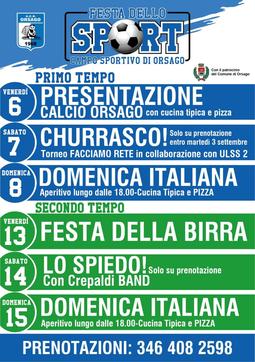 L’A.C.D. Orsago con il patrocinio del Comune di Orsago ha organizzato la Festa dello Sport 2024 che si terrà dal 6 al 15 settembre 2024 presso lo stadio di Orsago.