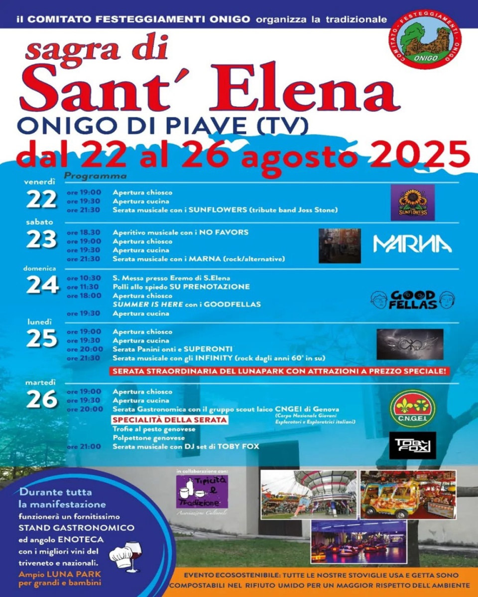 Il Comitato Festeggiamenti Onigo con il patrocinio del Comune di Pederobba ha organizzato la Sagra di Sant’Elena 2025.