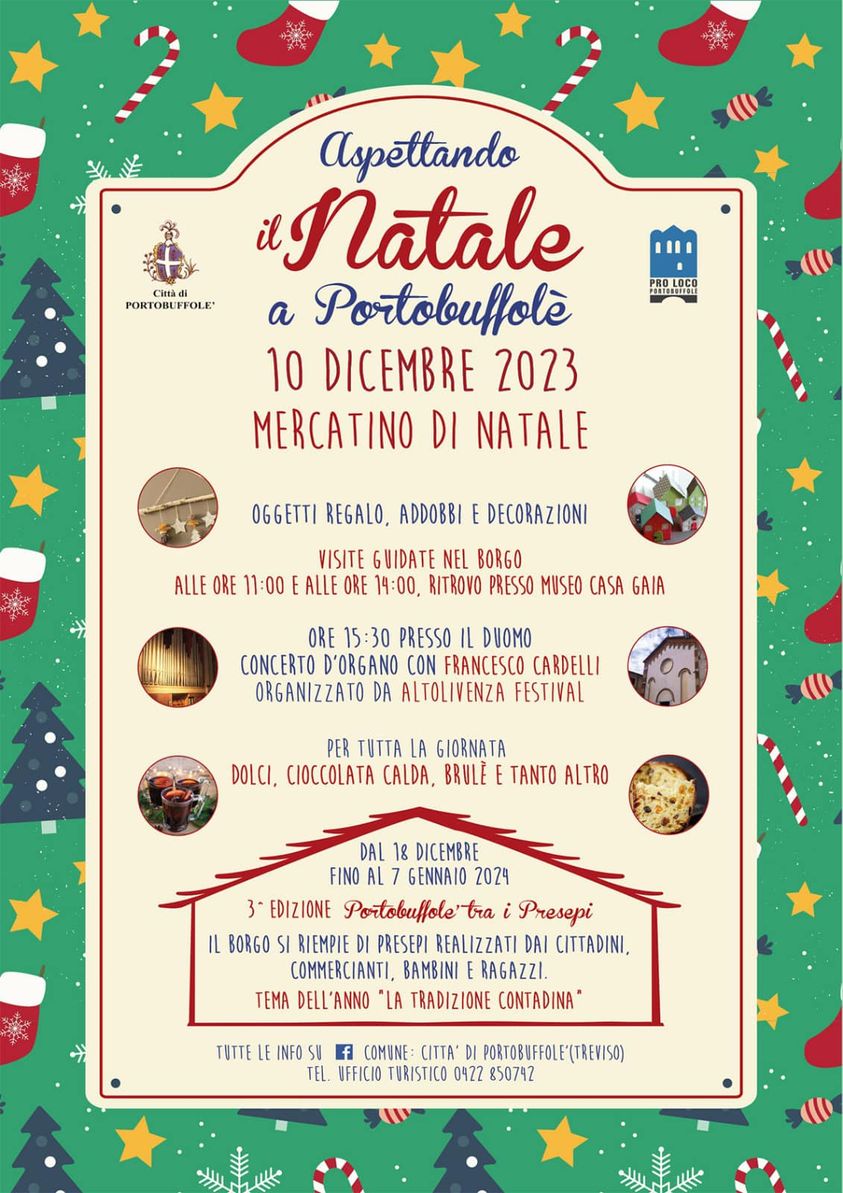 Il Comune di Portobuffolè con la collaborazione della Pro Loco di Portobuffolè ha organizzato Aspettando il Natale a Portobuffolè per domenica 10 dicembre 2023.