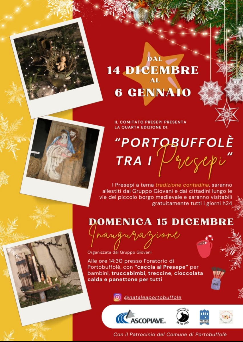 Il Comitato Presepi con la collaborazione della Pro Loco Portobuffolè, del Centro Culturale On the Road e con il patrocinio del Comune di Portobuffolè ha organizzato il 4° Portobuffolè tra i Presepi.