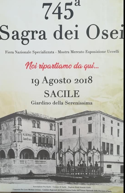 La Pro Sacile con il patrocinio del Comune di Sacile ha organizzato la 745ª Sagra dei Osei a Sacile che aprirà i battenti sabato 18 e domenica 19 agosto 2018.