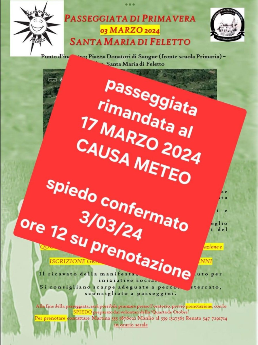 - ore 9.00 partenza della passeggiataa Santa Maria di Feletto con punto d’incontro in Piazza Donatori del Sangue (fronte scuola primaria)