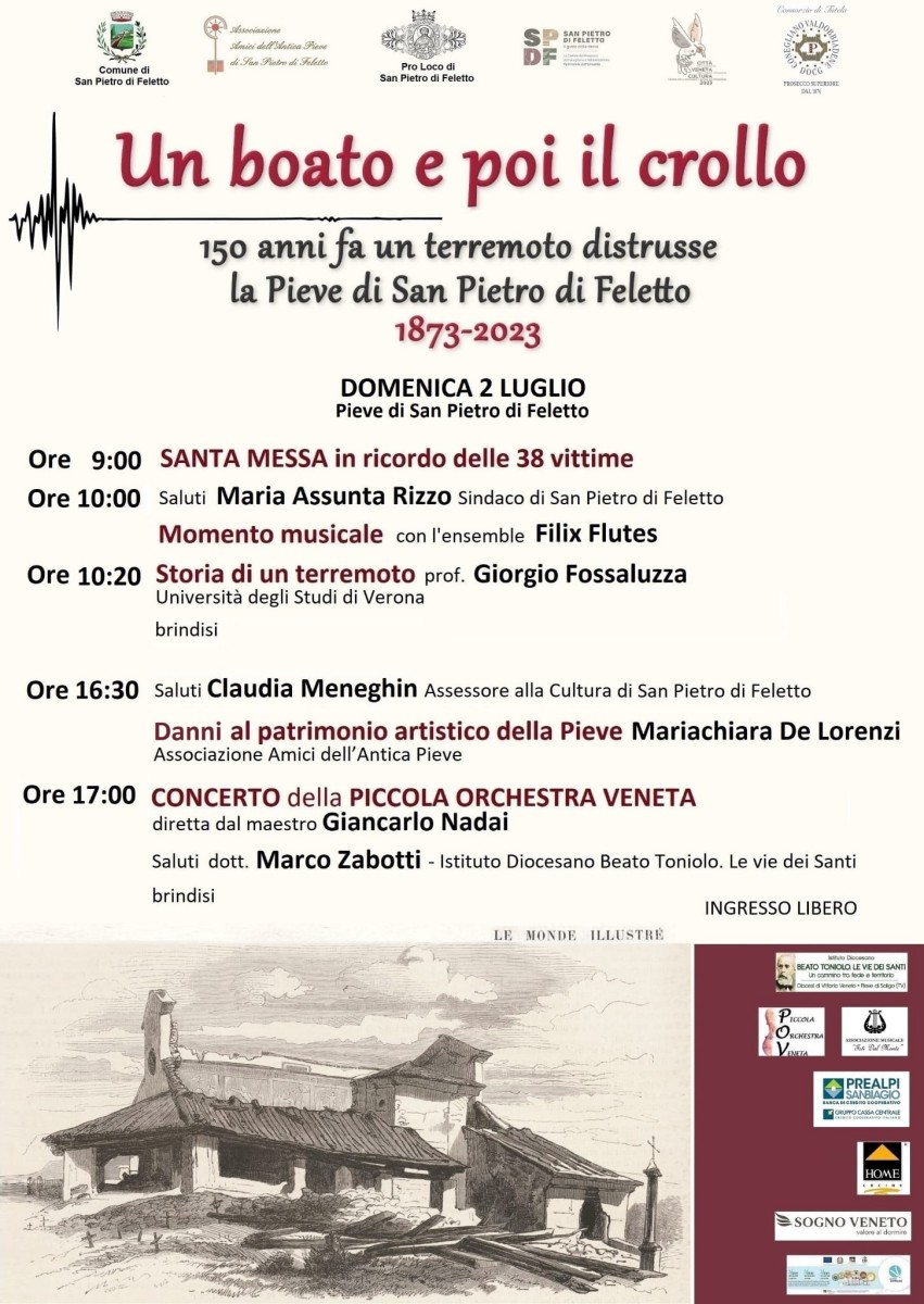 Il Comune di San Pietro di Feletto con la collaborazione della Pro Loco di San Pietro di Feletto, dell’Associazione Amici dell’Antica Pieve di San Pietro di Feletto nell’ambito della Città Veneta della Cultura 2023 ha organizzato una giornata dal titolo Un boato e poi il crollo.