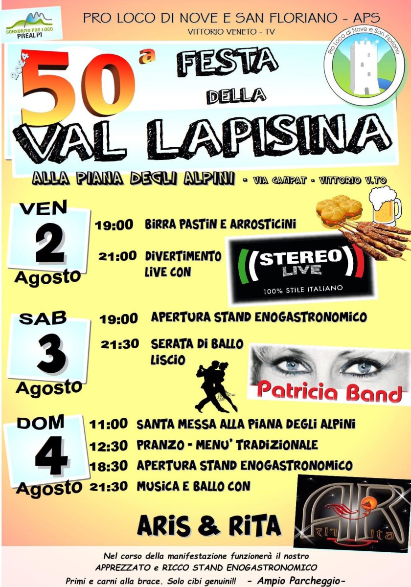 La Festa della Val Lapisina si terrà dal 2 al 4 agosto 2024 presso la Piana degli Alpini a Vittorio Veneto.