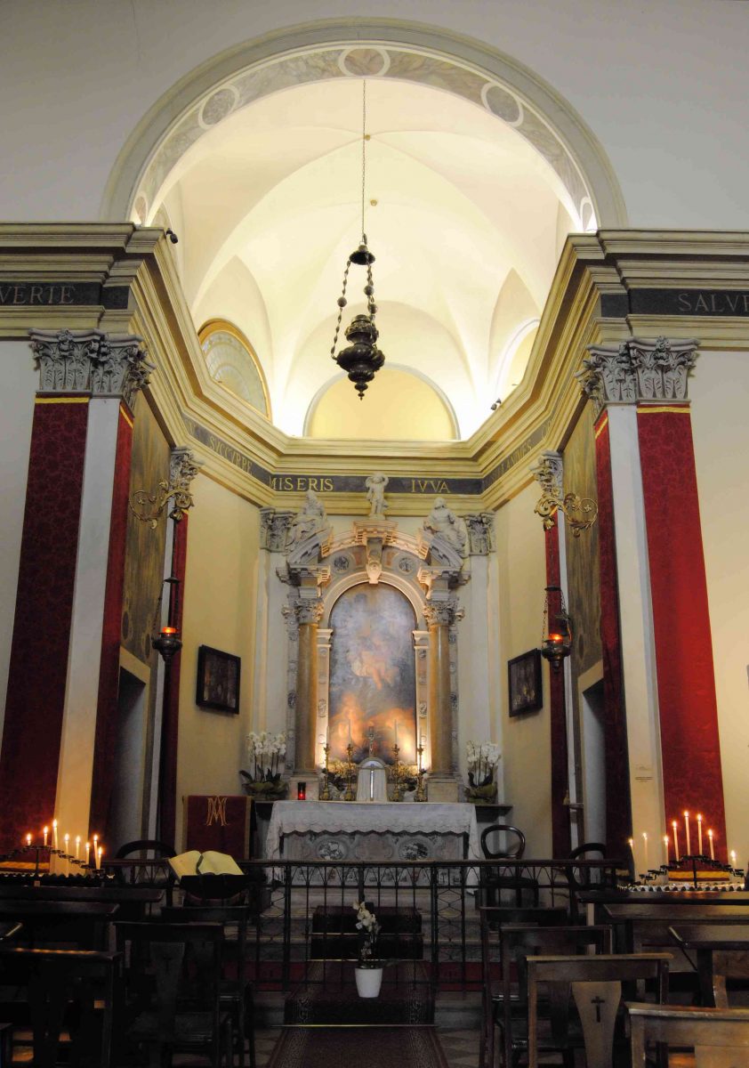 All’interno la chiesa ha un’unica aula impreziosita dal marmorino. Al centro del soffitto è dipinta l’Ascensione della Vergine.