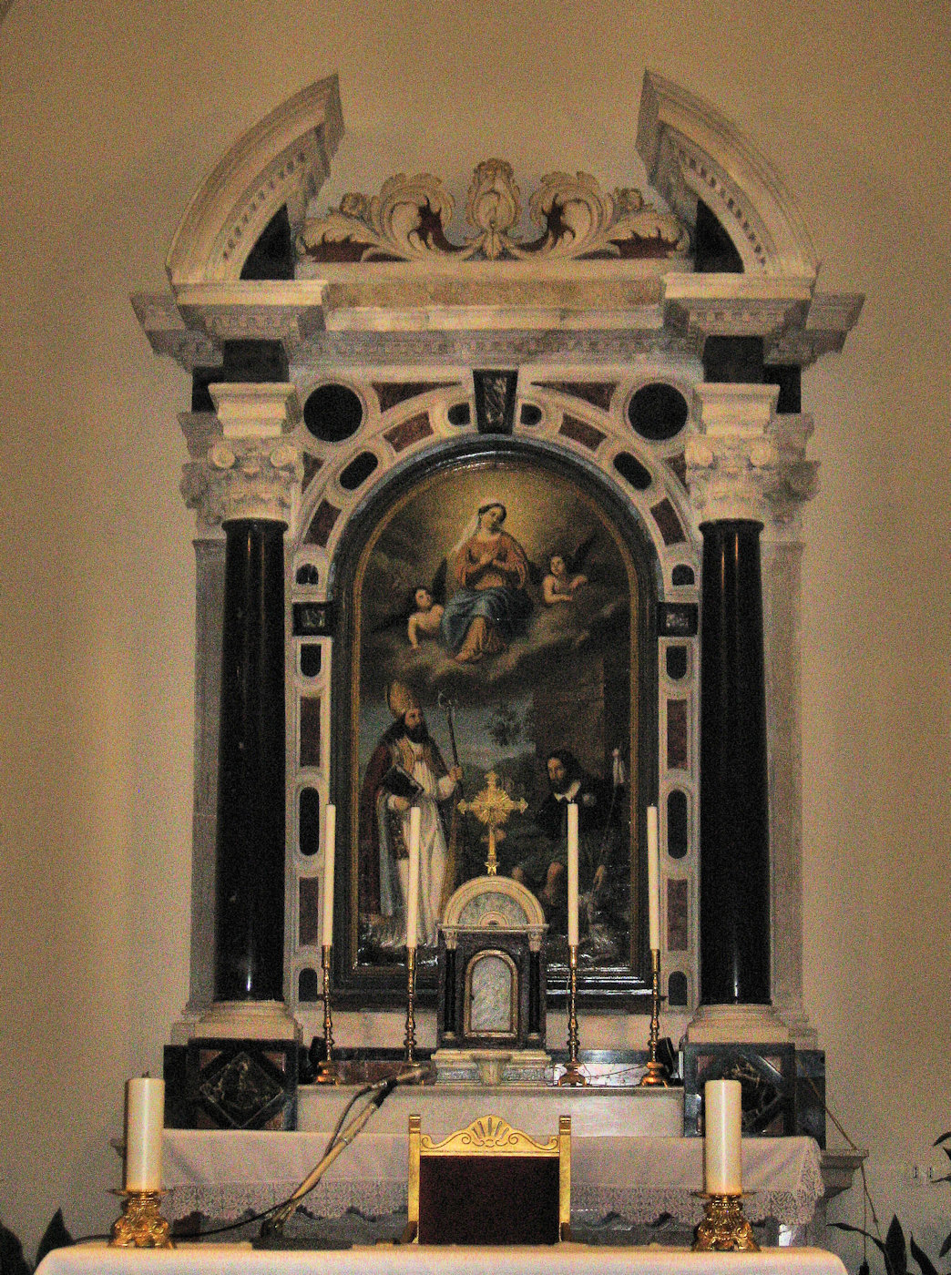 All’interno si può ammirare una pala d’altare settecentesca che raffigura la Madonna in cielo tra i Santi Zenone e Rocco.