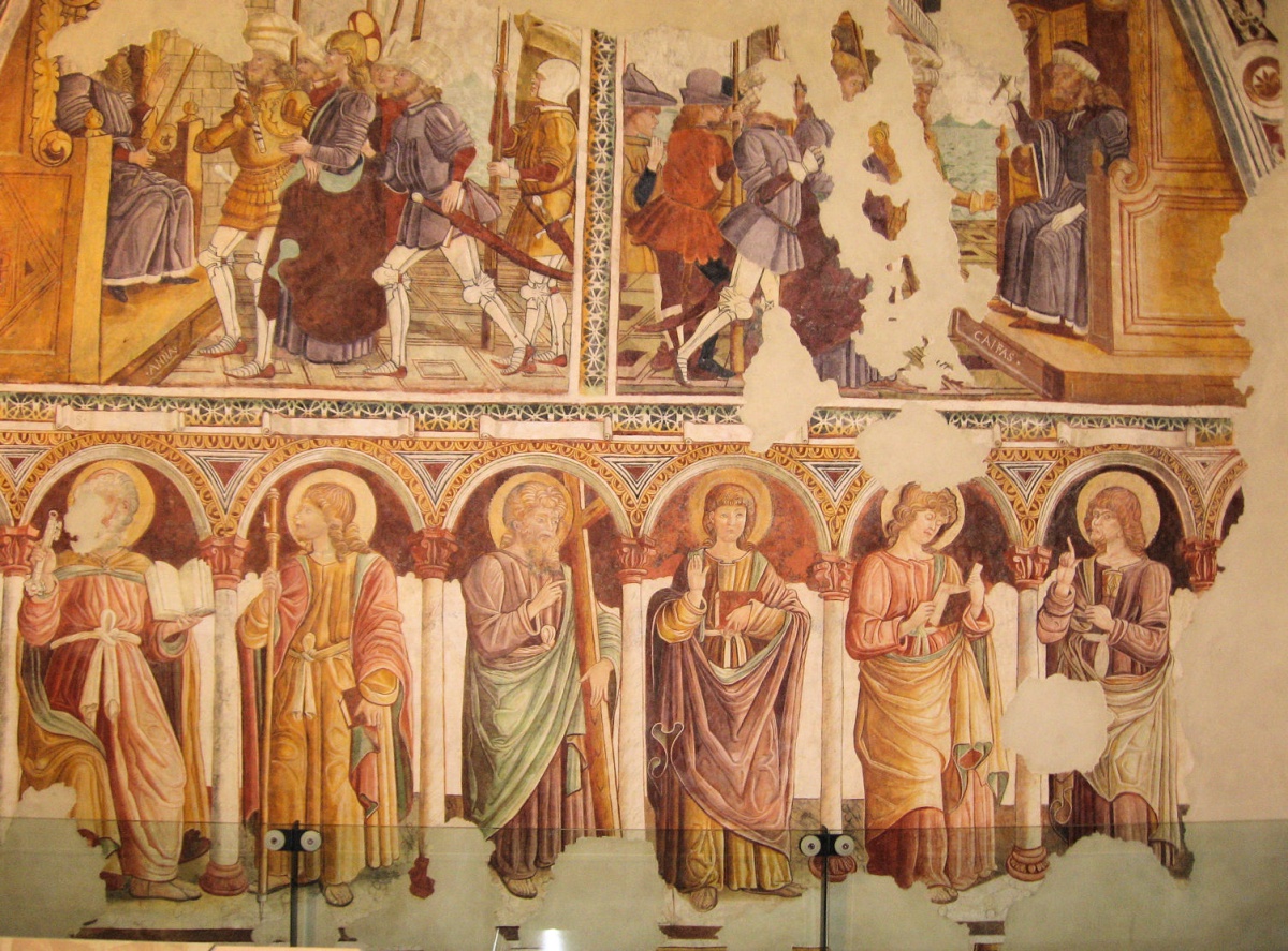 Sulla parete di sinistra della chiesa vi sono altri dipinti che raffigurano i sette apostoli, il processo di Anna e Caifa e tre apostoli dormienti nell’orto degli Olivi, mentre, sull’altra parete è raffigurato il processo di Pilato a Gesù e il ritrovamento della salma di Santo Stefano in una fognatura di Gerusalemme.