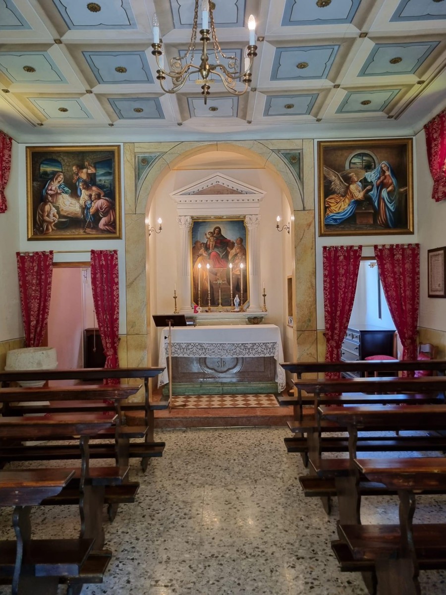 Internamente il soffitto è a cassettoni finemente decorati. La parte più antica della chiesetta risale al Quattrocento circa, si trova in prossimità di un ramo del fiume Aralt denominato in quella zona Gravon in via Cesare Battisti.