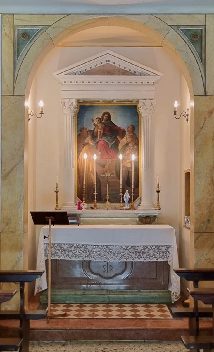 La pala d’altare raffigura la Madonna col Bambino in trono tra San Pietro e San Pancrazio, Sant’Antonio da Padova e santo prelato (non identificato), assegnabile alla fine del Settecento, nonostante l’impianto compositivo tipicamente Cinquecentesco.