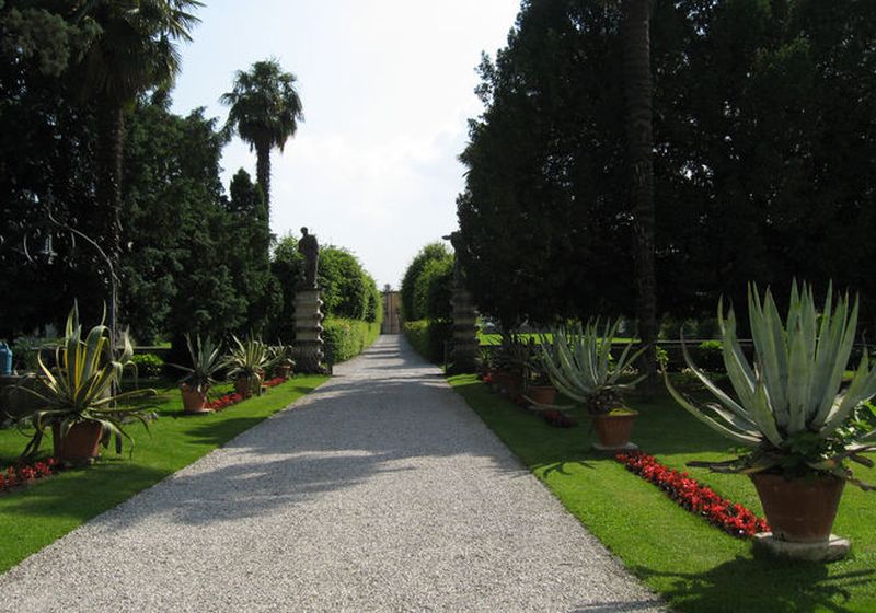 Sul fondo la villa si presenta maestosa con un corpo centrale rialzato rispetto alle due ali laterali.