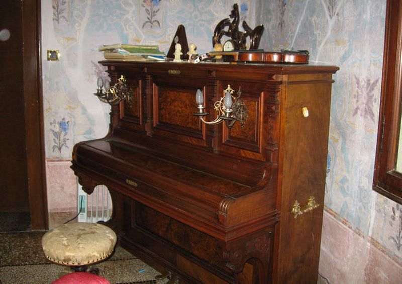 Una scalinata a due rampe con balaustre intercalate da piastrini conduce al piano rialzato dove si apre una trifora formata da portali con arco a tutto sesto: uno centrale d’ingresso con sopra uno stemma ed altri due ai lati con poggioli.