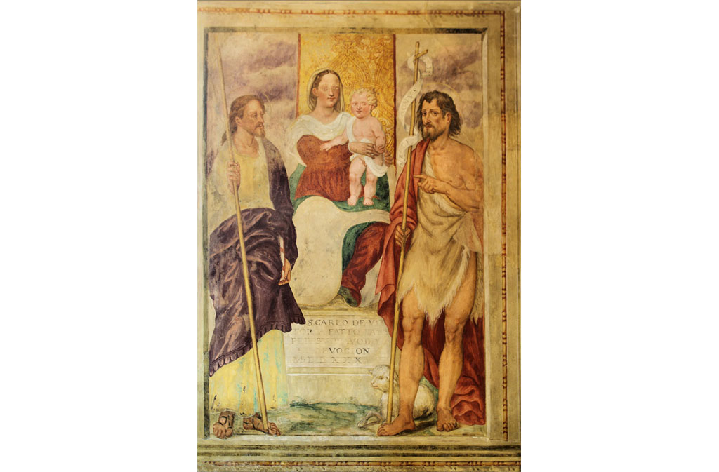 Sulla parete sinistra si trova un’opera in stile diverso, attribuita a Girolamo Stefanelli, raffigurante la Madonna in trono con bambino e due santi in piedi, San Giovanni Battista e San Giacomo minore con l’iscrizione “San Carlo de Vettor ha fatto fare per suo avodo et devocion MDLXXXXIII”.