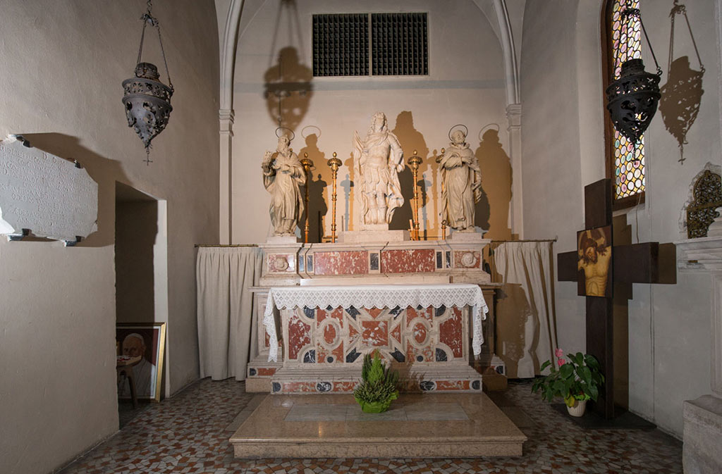 Sul lato sinistro, invece si trova la Cappella del Santissimo Sacramento. Destinata alla custodia del Santissimo Sacramento, ospita sullo sfondo un Sacro Cuore di Gesù opera di anch’essa di Pino Casarini.